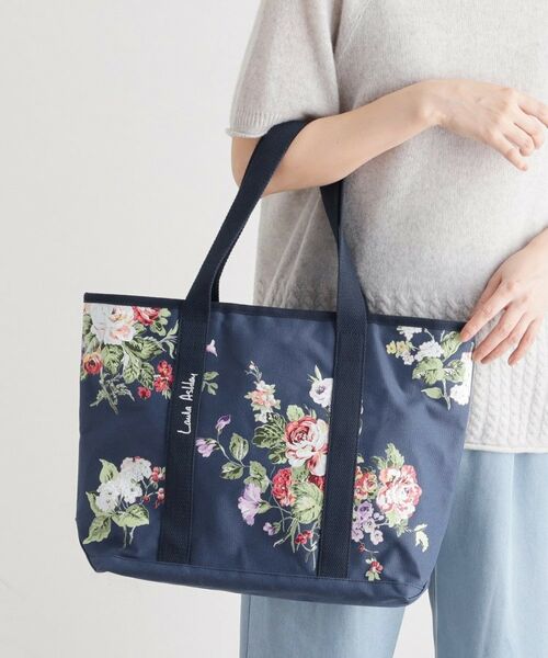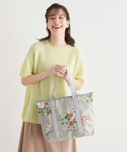 A4サイズや雑誌なども入れられるたっぷり荷物を入れられるトートバッグの全面に、華やかなフラワープリントと筆記体ロゴ刺繍が施されています。