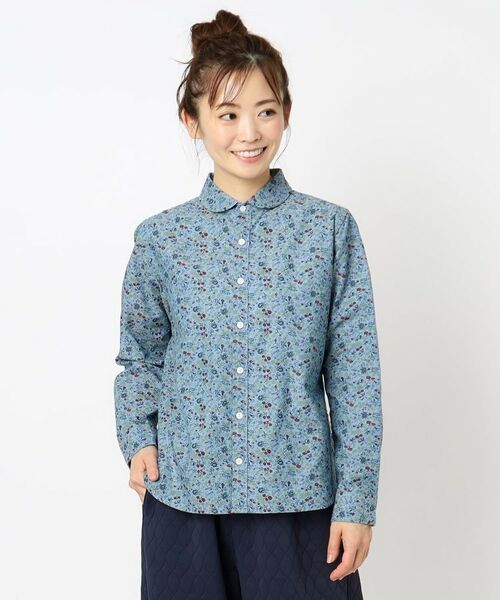 ロササンクタのプリントを程よいハリ感のあるダンガリー生地にプリントした、リバーシブルでも着用できるほど丁寧に縫製された美しい小さな衿のラウンドカラーブラウス。