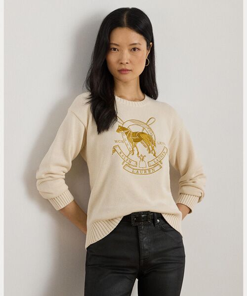 コームドコットンで編み上げて柔らかな手触りを生み出したクルーネックセーター。フロントに刺繍で描いた馬のモチーフとLauren Ralph Lauren MCM LXVIIのロゴをあしらい、Ralph Laurenのエクエステリアン風スピリットを体現。リラックスフィットのシルエットとドロップショルダーで、さらに快適な着心地を実現