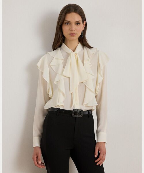 カスケードフリルとタイネックのデザインが流れるようなジョーゼットの生地を完璧に引き立てるブラウス・リラックスフィット・タイネックでアクセントをプラスしたバンドカラー / ボタン付き前立て / 特別に開発したLauren Ralph Laurenのロゴ入りボタン・長袖、ボタン付きバレルカフス / 前立て、肩、フロントのトップス部分にカスケードフリルのはめ込み・ラウンド型にカーブした裾・裏地なし・モデル身長178cm、着用サイズS※商品の色味は、光のあたり具合など諸条件により色感が多少異なって見える場合がございますので予めご了承下さい。