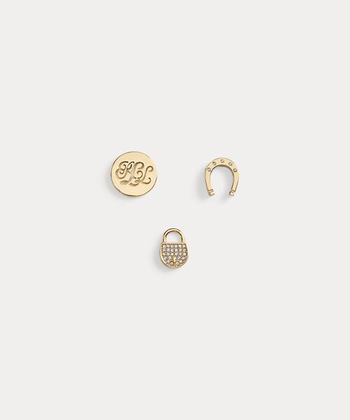 14Kの金メッキを施したピンのセット。馬蹄型スタイル、パヴェセットのパドロックデザイン、シグネチャーのロゴのピンを含む、Lauren Ralph Laurenのアイコニックな美学にインスパイアされたさまざまなシルエットが特徴・ピン3本のセット・蹄鉄のピン・パドロック型のピンとロゴのピン・バーピン留め・エレガントなLRLのボックスに収納・14Kの金メッキを施したブラス、ガラス※商品の色味は、光のあたり具合など諸条件により色感が多少異なって見える場合がございますので予めご了承下さい