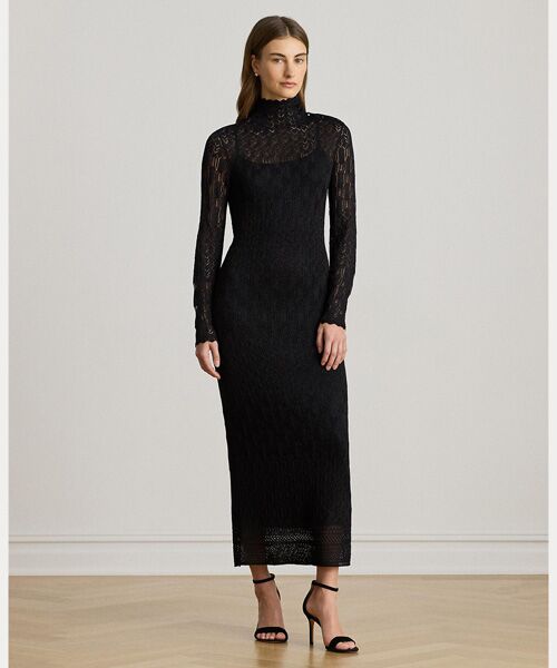 ポインテール編みのパターンとスカラップドエッジがエレガントな魅力を引き立てる、ミディ丈のタートルネック セーター ドレス。透けを防ぐジャージーのスリップの裏地付き・タイトなシルエット / くるぶしよりやや上の着丈・スカラップ仕上げのタートルネック / 首の左側と肩に沿って5つのボタン付きプラケット・長袖、スカラップカフス・スカラップ仕上げの裾 / スリップの裏地付き・モデル身長178cm、着用サイズS※商品の色味は、光のあたり具合など諸条件により色感が多少異なって見える場合がございますので予めご了承下さい。