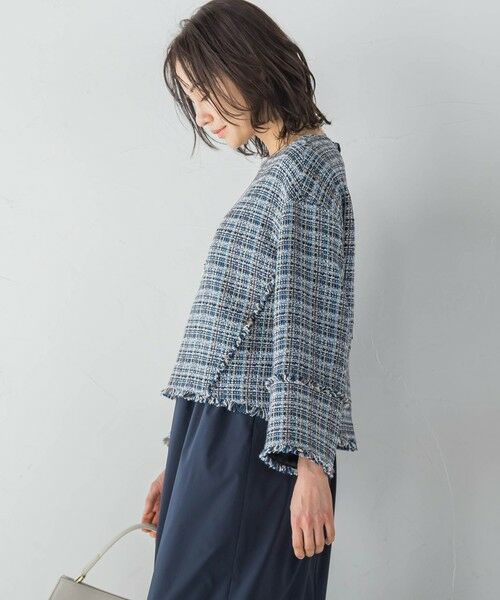 フリンジディティールを利かせた春らしいツイードブラウス。
