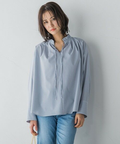 レイヤードスタイルも一枚着スタイルもこなれて見えるフリルネックブラウス。