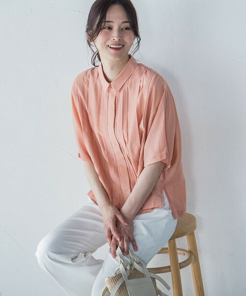 シアー素材ですが、身頃に太めのタックを入れているので透けすぎず、
