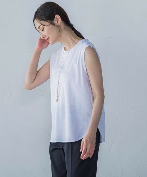 一枚着としてもニットとのレイヤードにも着まわし可能なノースリーブカットソー。