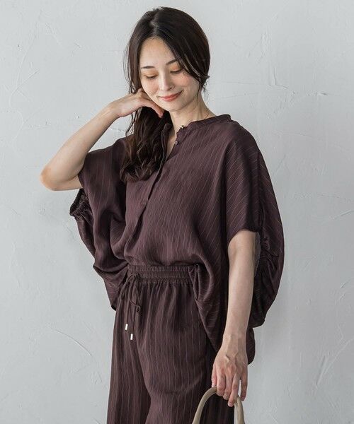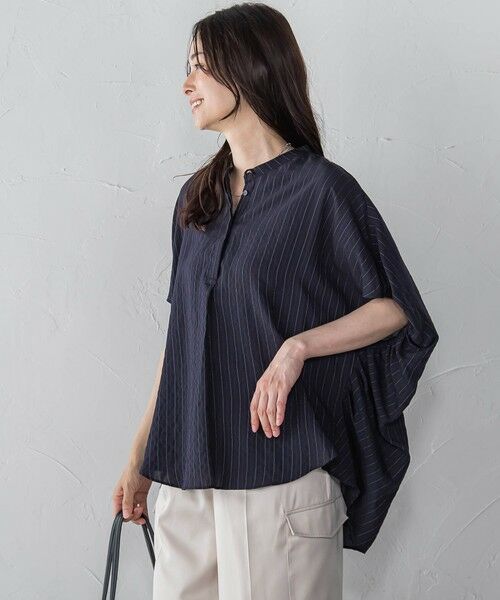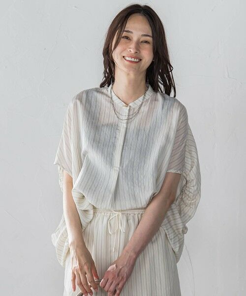 ほどよい光沢と落ち感が美しい、キュプラ混のストライプブラウス。肩まわりをやさしくカバーするフレンチスリーブと、ゆったりとした身幅で涼しく着られる一枚です。フロントは比翼仕立てでミニマルな印象に。ワイドパンツやスカートにさっと合わせるだけで、大人のカジュアルスタイルが完成します。