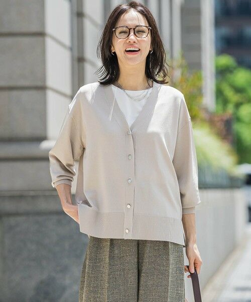 すっきりとしたVネックは、開きが深すぎず、ボタンを閉じても上品で“きちんと見え”が叶います。