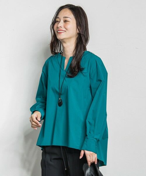 首元をすっきりと見せるキーネックデザインと、背中に入れたタックでふんわりと揺れる立体感を表現したブラウス。