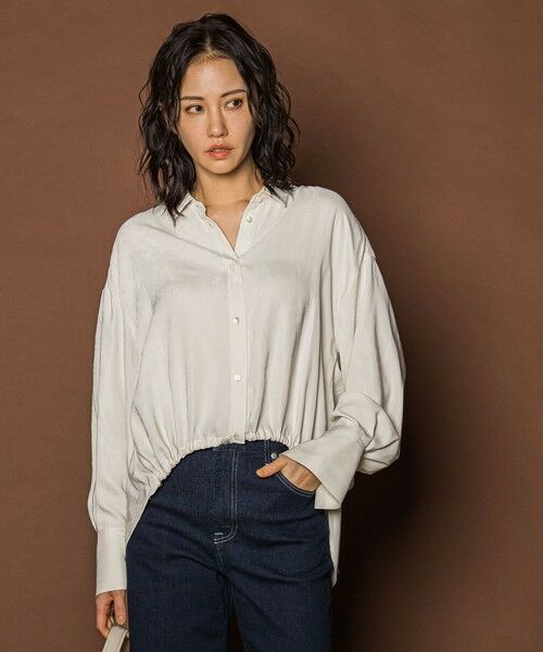 なめらかなサテンスエード素材調を使用した、上品なドロストシャツブラウス。