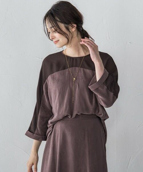 柔らかなスエード調サテンに、繊細なシアー切り替えを組み合わせた上品なブラウス。
