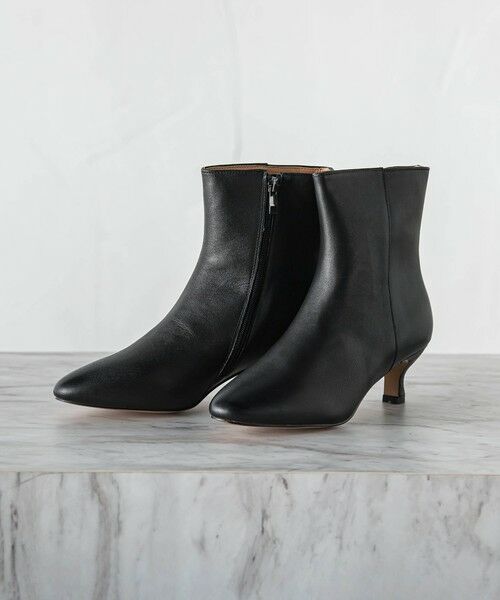 ポインテッドトゥのシャープなフォルムに、安定感のあるミドルヒールを組み合わせたブーティー。