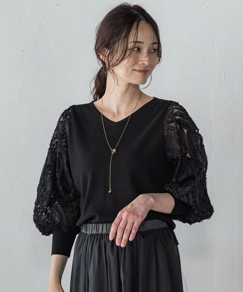 ポイントは、袖にあしらった繊細な刺しゅうレース。透け感のある生地に立体的な刺しゅうを重ねることで、さりげない華やかさを演出します。
