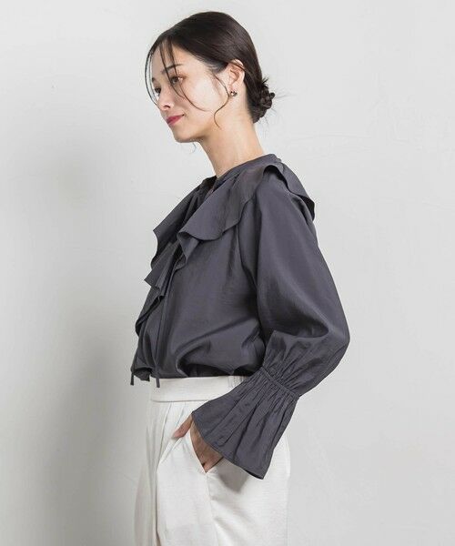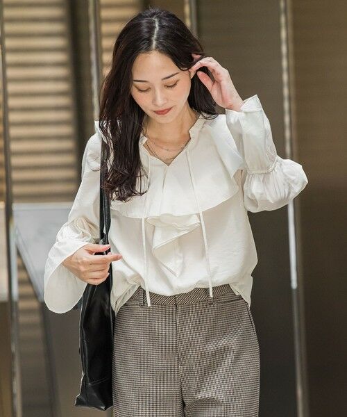 大きめのラッフルが顔まわりを華やかに見せるブラウス。