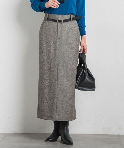 上品でシックな印象を演出する、ミディアム丈のツイードスカート。