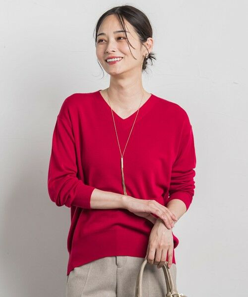 シンプルながらもデコルテをすっきりと見せるVネックラインが女性らしい印象を演出します。