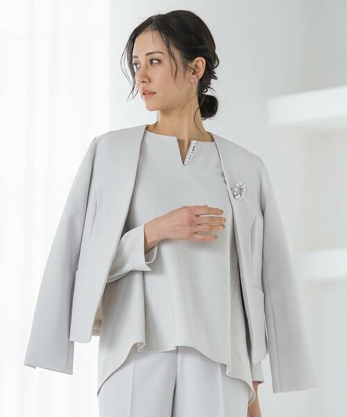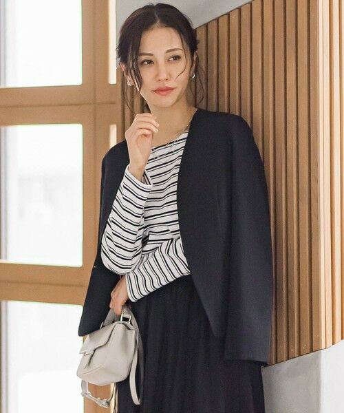 ノーカラーの端正なフォルムが印象的なジャケット。すっきりとしたシルエットながら、ストレッチ性の高いトリクシオン素材により、長時間の着用も快適です。肩まわりやアームホールも動かしやすく、きれい見えと機能性を両立しています。