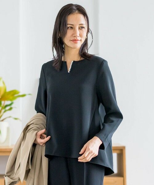 胸元のスリットにあしらったパールパーツが華やかさを添え、シンプルなシルエットに上品なアクセントを加えています。