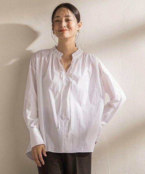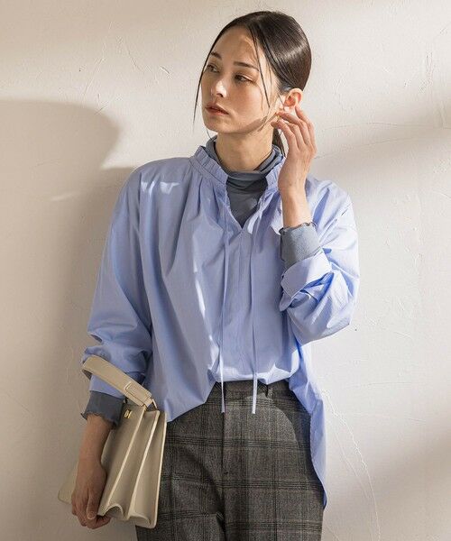 繊細なギャザーをあしらったスタンドカラーが顔まわりを華やかに見せるブラウス。