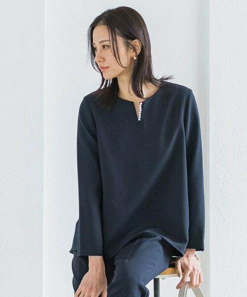 胸元のスリットに添えられたパールパーツが華やかさを演出し、シンプルなシルエットに上品なアクセントを加えています(パールは取り外し可能)。