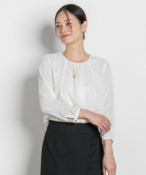 フロントにタックを入れ、すっきりと上品に見えるブラウス。シンプルながら立体感があり、1枚でも様になるデザインです。後ろ中央にスリット開きを配し、着脱しやすく軽やかな抜け感をプラスしました。
