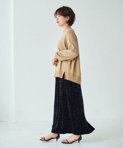 ベーシックなハイゲージの編み地ですが、程よく厚みと張りを持たせているため体のラインを拾い過ぎずに着られます。