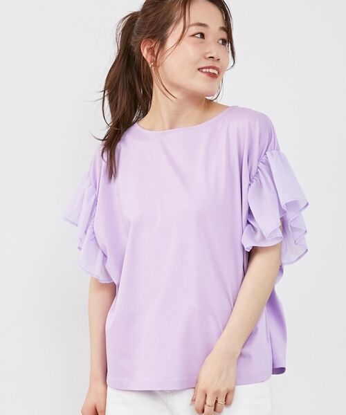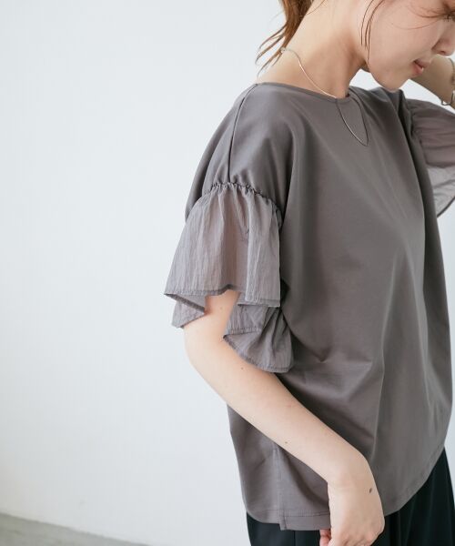 タフタ素材の切り替え袖がポイントのデザインカットソーです。
