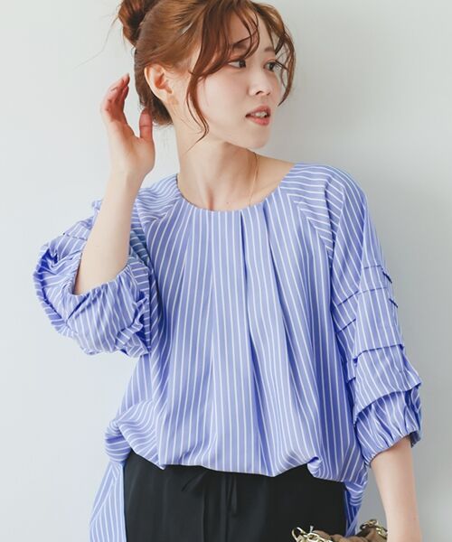 爽やかな配色が目を惹くストライプ柄の素材を使用したブラウス。●ポイント袖に入れたタックで立体感が生れる、変形スリーブのデザインが特徴です。程よくゆとりのあるサイジングで初夏まで快適に着られる7分袖で幅広いコーディネートに合わせられるブラウスです。●おすすめコーデ李タックス感のあるパンツと合わせたスタイリングもおすすめです。洗い可 ドライクリーニング可 陰干し*摩擦や水濡れによる色落ち・色移りにご注意下さい。
