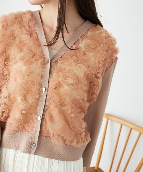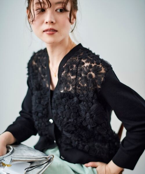 ふんわりと透け感のある身頃にフラワーモチーフのチュールをふんだんに施し立体的な素材感がポイントのカーディガン。