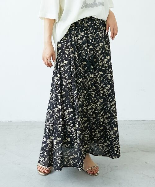 大胆に施された花柄はあえてモノトーンで仕上げてモードな大人っぽさをプラス。