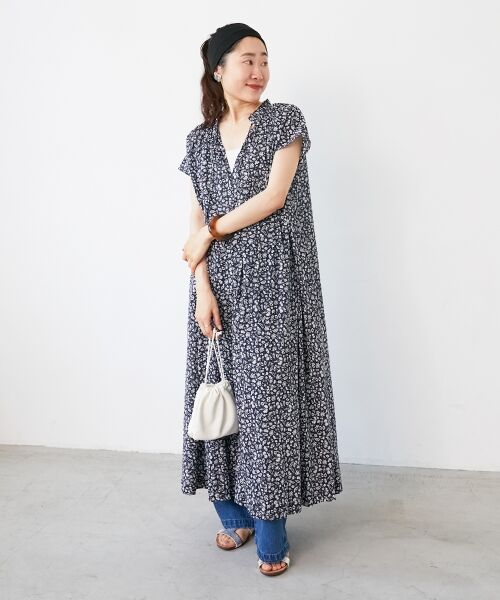 《手洗い可能》フラワープリントネックギャザーワンピース