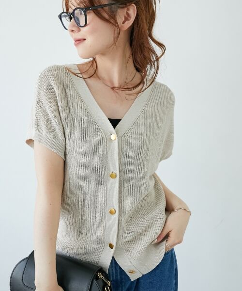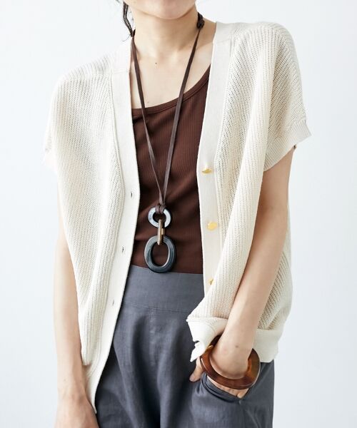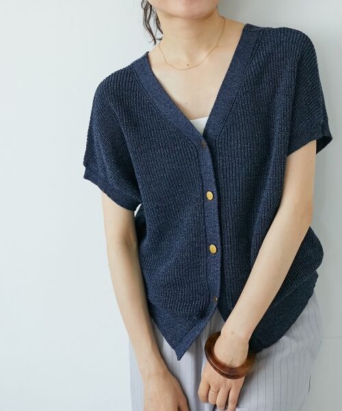 ぺーパーヤーンを使用したシャリ感のある独特な風合いに、表情あるアゼの編地が清涼感漂うニットプルオーバー。カーディガンをベースに前後2wayで着れるデザイン。●ポイント程よいゆとりのシルエットで身体のラインを拾いにくく、ややコンパクトめの着丈で合わせるボトムを選ばないのも嬉しいポイントです。●おすすめコーデゴールドボタンもアクセントになりシンプルなワンツーコーデも華やかに演出してくれ、これからの季節におすすめの一枚です。手洗い可 ドライクリーニング可 陰干し*摩擦や水濡れによる色落ち・色移りにご注意下さい。
