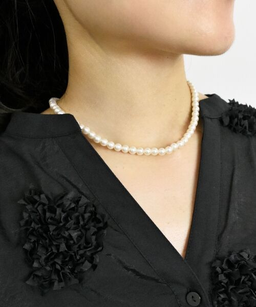 艶やかな程よいサイズ感のパールが首元を華やかにしてくれる、ショート丈のネックレス。●ポイント留め具はマンテルデザインになっており、シンプルながらもさりげないアクセントに。●おすすめコーデ上品にまとめるのはもちろん、Tシャツやシャツに合わせてカジュアルダウンするのもおすすめです◎*アレルギー体質の方や体調が低下している方などかぶれることがありますのでご注意下さい。
