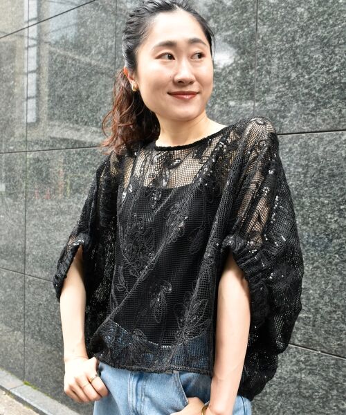 コード゙刺繍にスパンコールが施されたファンシー生地を使用したドルマンブラウス。