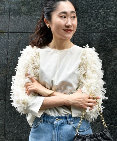 身頃にはシャツ生地、袖にチュールフリンジのように編み込まれたファンシー生地を使用し一枚でパッと華やかなブラウス。