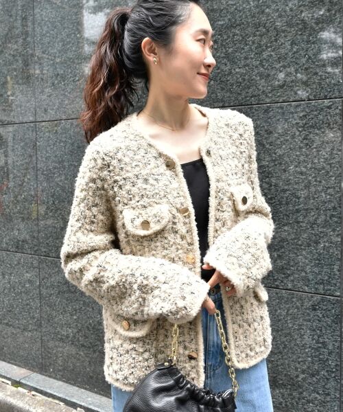 ニット素材なので、布帛のツィードジャケットよりもソフトで身体に馴染むため、カッチリし過ぎずストレスフリーで着用して頂けます。 ニットでしか表現できない表面変化が可愛い一枚です。