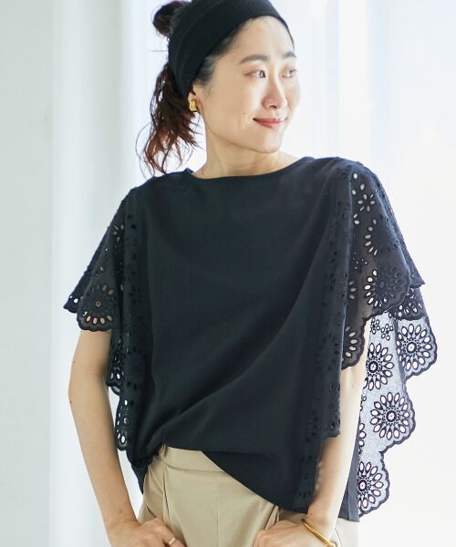 スカラップレースを袖として大胆に組み合わせ一枚着プルオーバー。