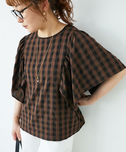 フレアスリーブのディテールが、女性らしいブラウスです。
