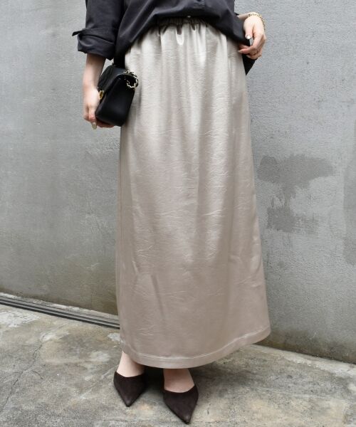 光沢感がありレザーのような表面感が特徴のナロースカート。