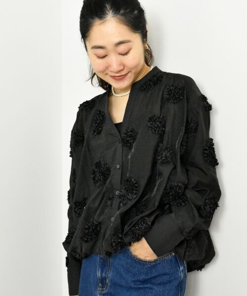 大きめのフラワーモチーフで1点で華やかさを演出してくれるのでシンプルボトムと合わせるだけでも、着映えるブラウスです。