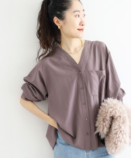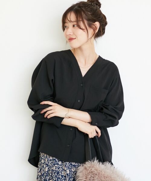 ゆったりしたシルエットで女性らしいVネックのデザインシャツブラウスです。