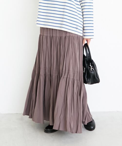 クリンクル加工でベーシックなプリーツよりも動きのあるデザインでキレイ目になりすぎず、カジュアルな雰囲気で着ていただけます。