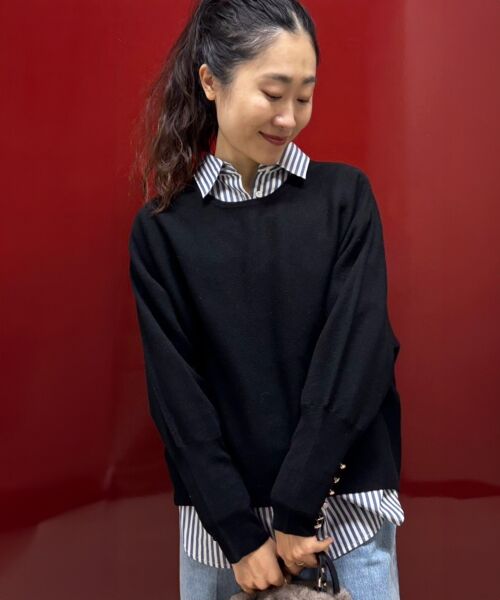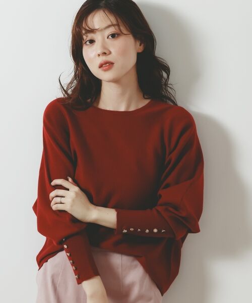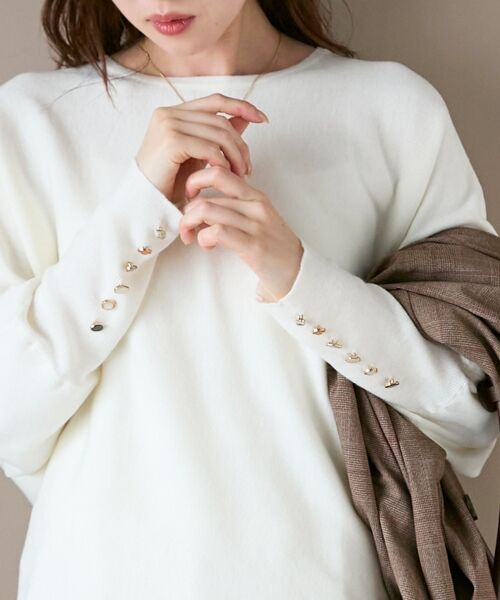 着用感: 袖のジュエリーボタンが華やかなアクセントに。首元も程よいあき具合で顔まわりスッキリします。