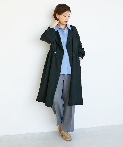 シンプルなノーカラーのデザインに、ドロストのアクセントをプラスしたロングコート。