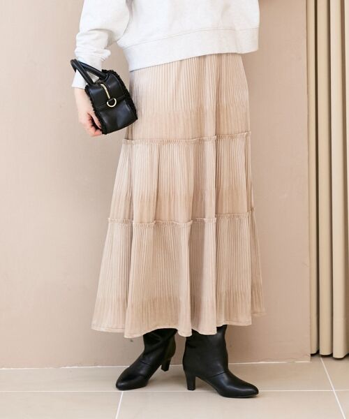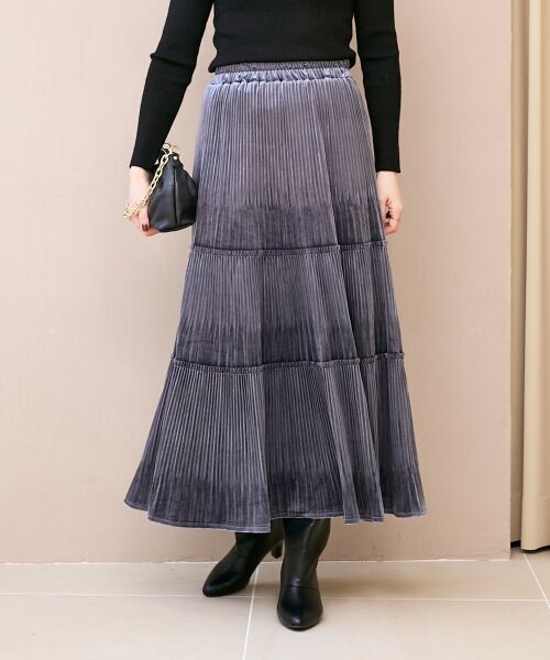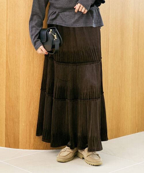 柔らかく光沢感のあるベロア素材に、動くたび揺れるプリーツが映えるスカート。