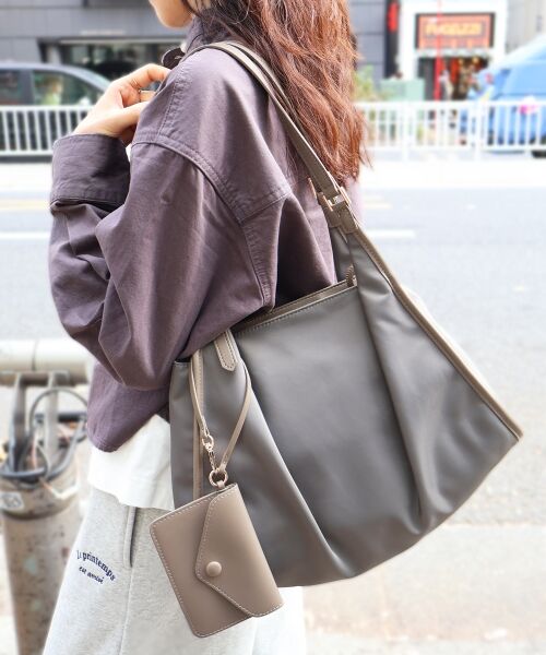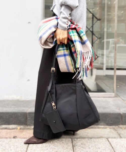 丸みのあるデザインと、ベルトハンドルがアクセントになったナイロンバッグ。●ポイントハンドルの長さが調整でき、ハンドバッグや肩掛けとしてシーンに合わせてお使いいただけます。●おすすめコーデ軽量で丈夫なナイロン素材を使用し、普段使いからお出かけまで幅広く活躍するアイテムです。[ポーチ]タテ9cm/ヨコ13.5cm*摩擦や水濡れによる色落ち・色移りにご注意下さい。*デリケートな素材を使用しておりますのでお取扱いにご注意下さい。