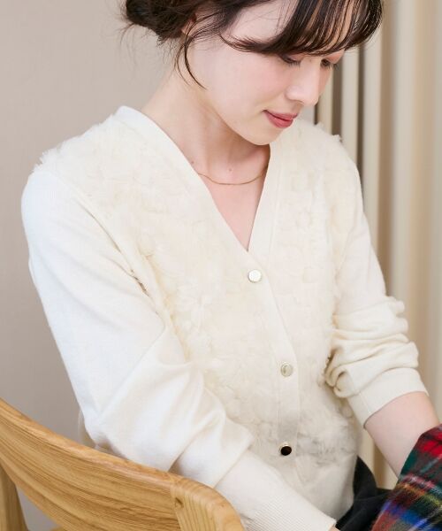 フラワーモチーフのチュールをふんだんに施し立体的な素材感がポイントのカーディガン。