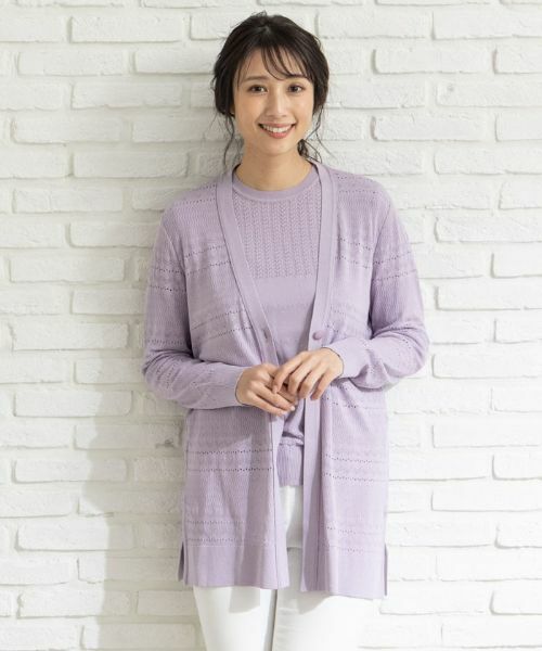 レースのように美しい透かし編みボーダーが魅力的なニットカーディガン。ヒップまで隠れるゆったりとしたシルエットがリラックス感のあるデザイン。プレーンなカットソーなどにさらっと羽織るだけでも春らしいコーデに。
