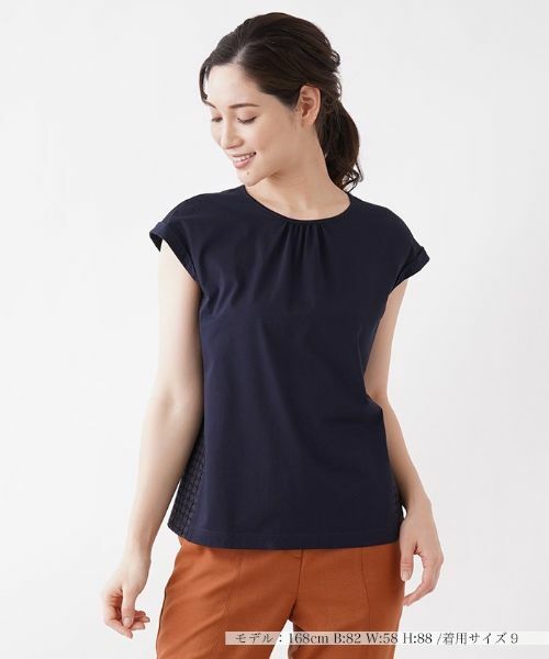 サイドのレース切り替えがほんのりとフェミニンな雰囲気を漂わせます。軽やかな着こなしが楽しめる、これからの季節にぴったりなブラウスです。