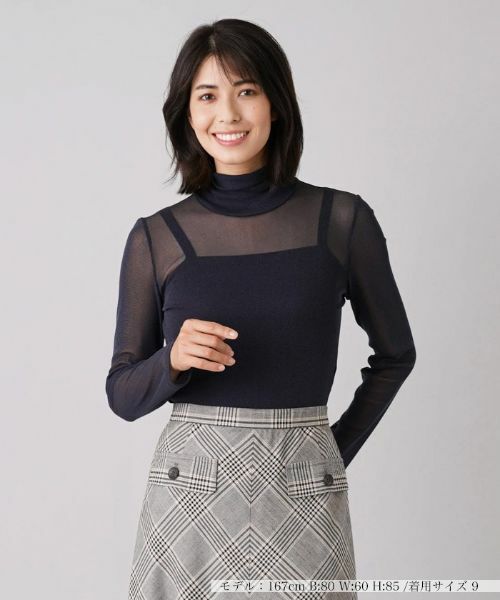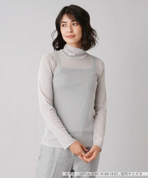 繊細な透け感のシアー素材を用いた、大人の女性らしいレイヤードスタイルに欠かせないトップス。ナイロンにシルクをブレンドした上質な生地の風合いが感じられる1枚。くしゅっとさせたドレーピーなハイネックが顔周りをスタイリッシュに引き立てます。ジャンパースカートにもジャケットにも合わせやすく、インナーとして取り入れるだけで装いをトレンドライクにシフトできるアイテムです。
